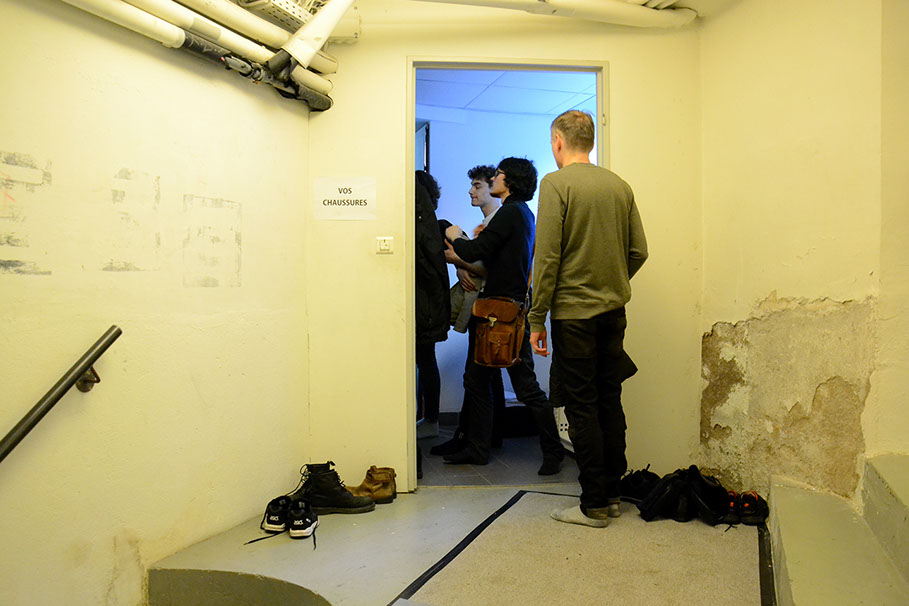 Si iels répondent "OUI", les visiteur·euse·s sont invité·e·s à monter une volée de marches et à se déchausser.