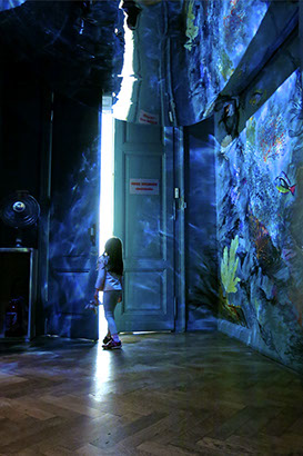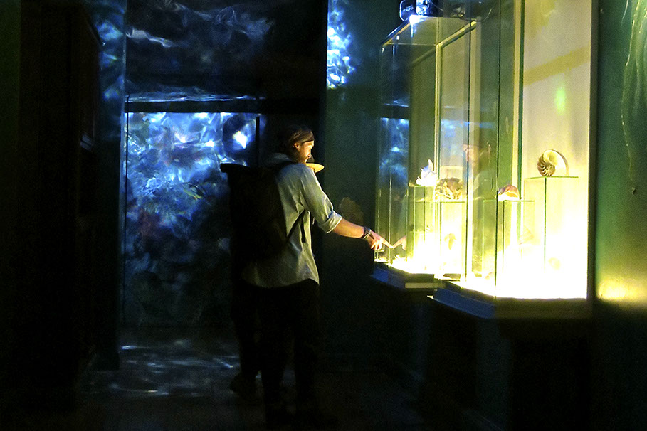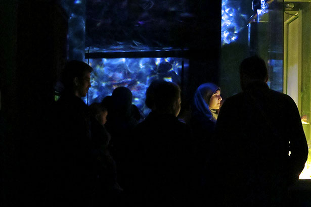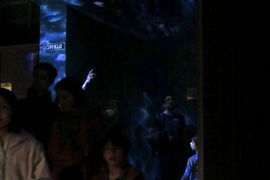 De couloir en couloir, le visiteur circule, poisson dans l’eau. Il passe devant les aquariums, et entre à son tour dans le bocal ; happé par les reflets de lumière, il lui semble sentir au-dessus de sa tête la surface de l’eau. Elle se ride au passage des mouvements qui la traversent, et renvoie l’image retournée des corps baignés dans cet élément nouveau. Puis vient la fin de l’apnée : le flot des spectateurs circule, et la visite reprend son cours.