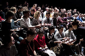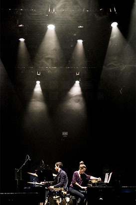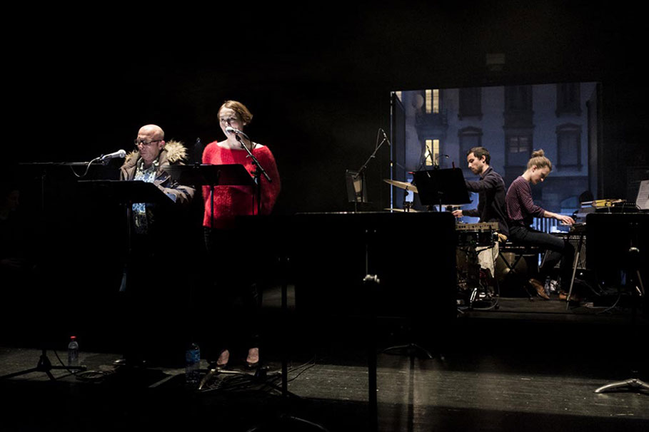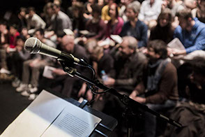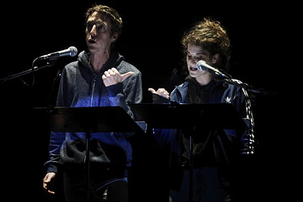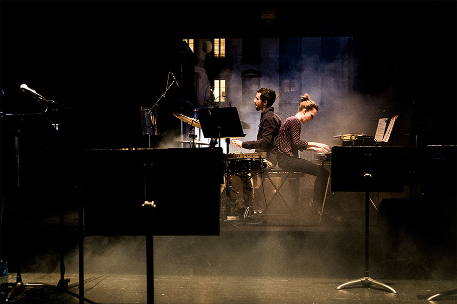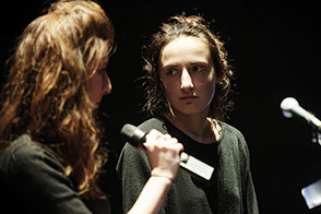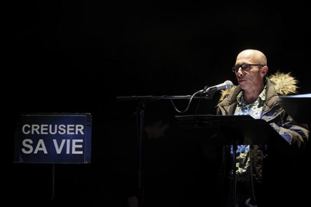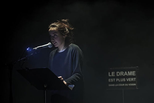 L’espace de jeu est découpé de jardin à cour par des bandes de lumières, qui sont différents plans de jeu. Les lecteurs peuvent ainsi entrer et sortir de la lumière. Des pupitres viennent rythmer l’espace, présences tangibles de la parole en attente.