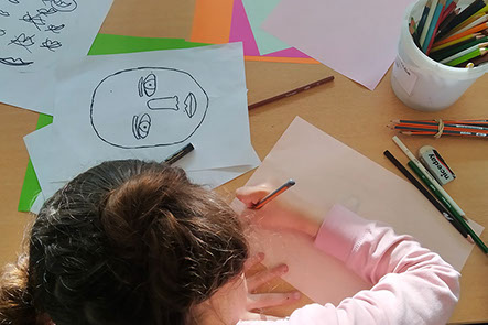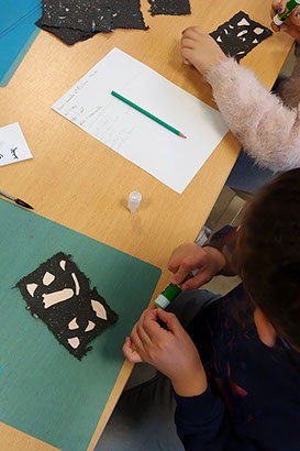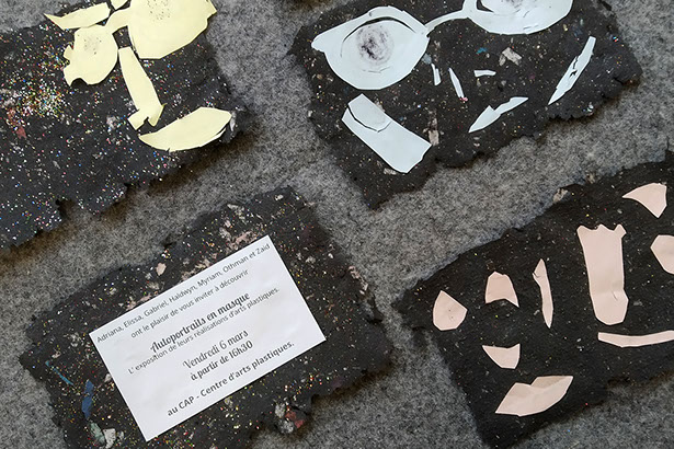 Séance 3. Découpe des parties du visage qui composent l'autoportrait, puis collage des formes obtenues pour créer les cartons d'invitation à l'exposition. Utilisation des chutes "en creux" pour créer des pochoirs et reproduire les formes sur le papier fait main.
