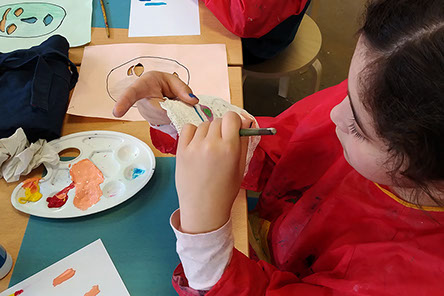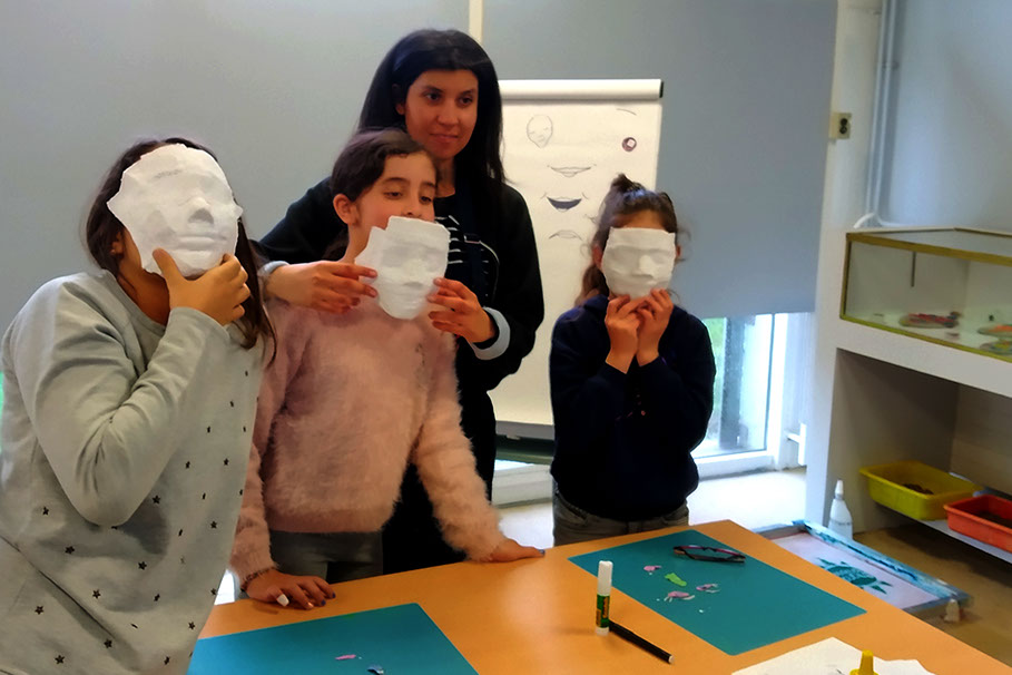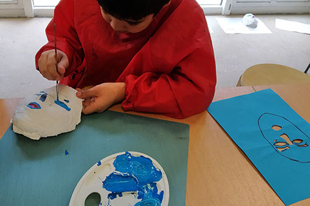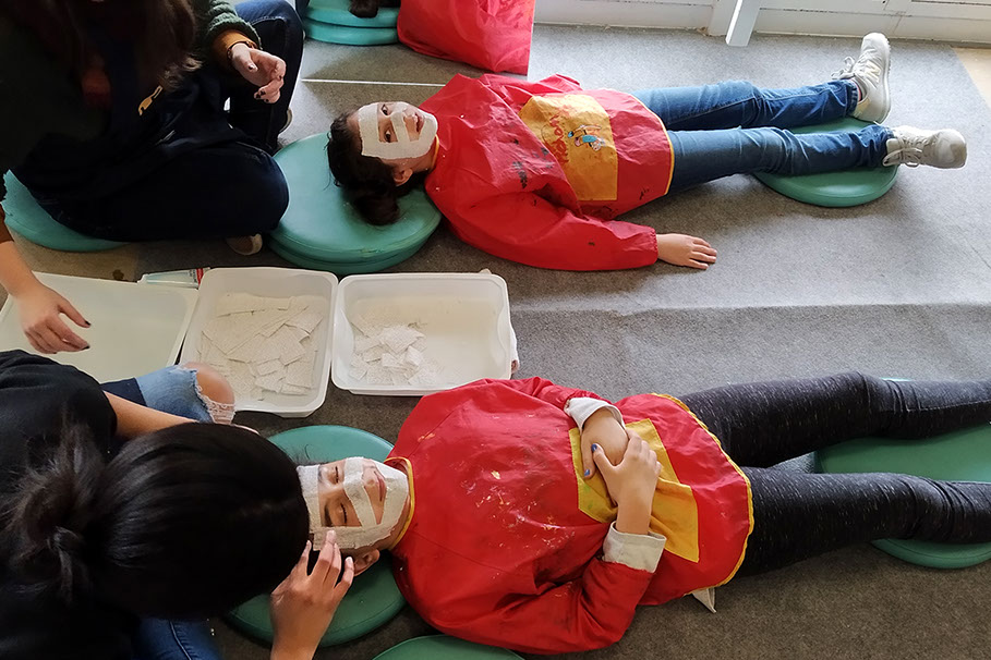 Séance 4. Moulage des visages en plâtre. Collage des éléments de l'autoportrait réalisé sur le moulage du "visage réel". Peinture du fond autour des parties collées.