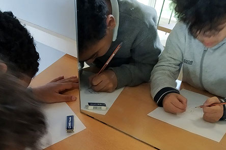 Séance 2. Dessin d'un autoportrait en traits à partir de l'observation de son visage dans un miroir. Travail sur les traits caractéristiques, les asymétries, les proportions.