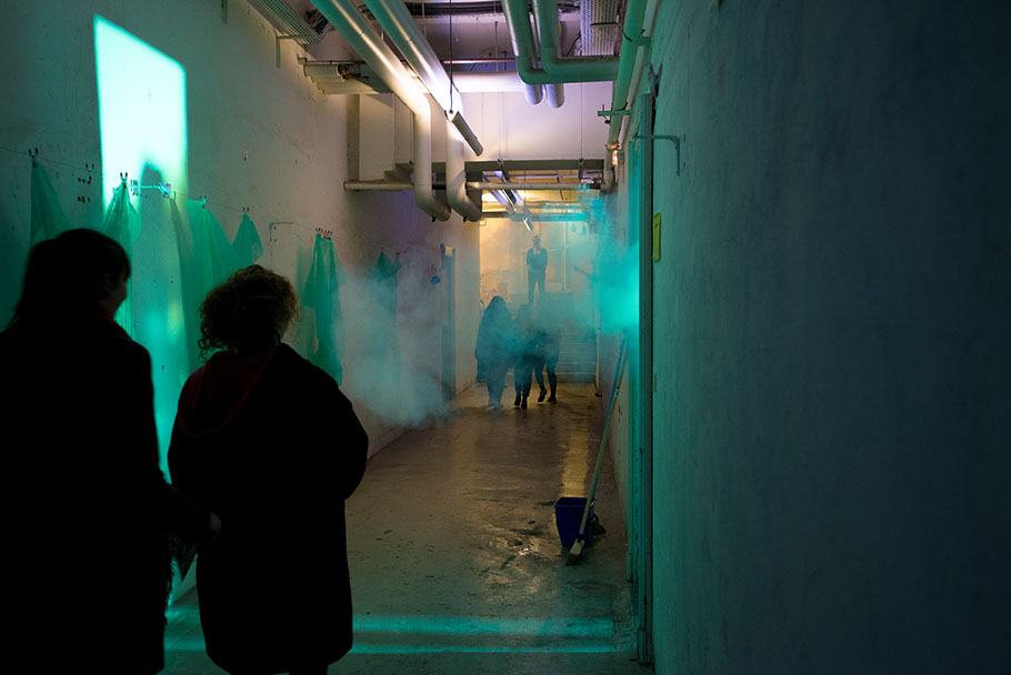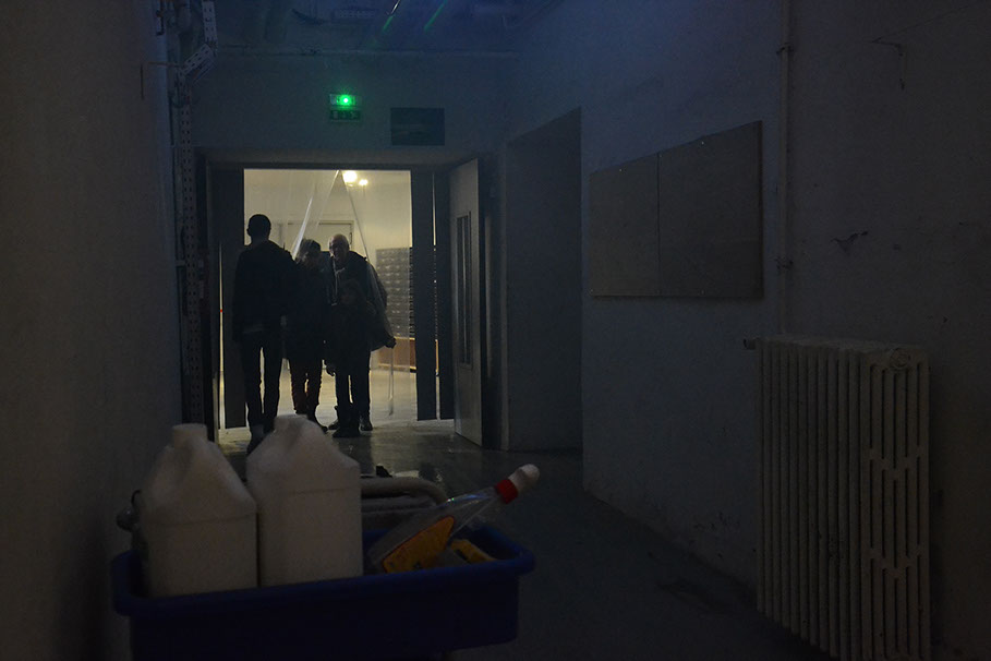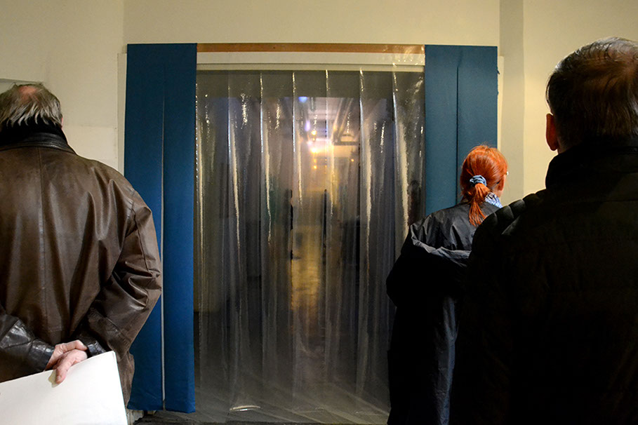 Les visiteur·euse·s écartent le rideau pour se retouver devant un long couloir sombre. Une voix énumère des consignes de sécurité.