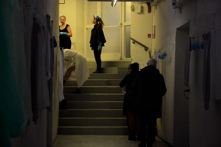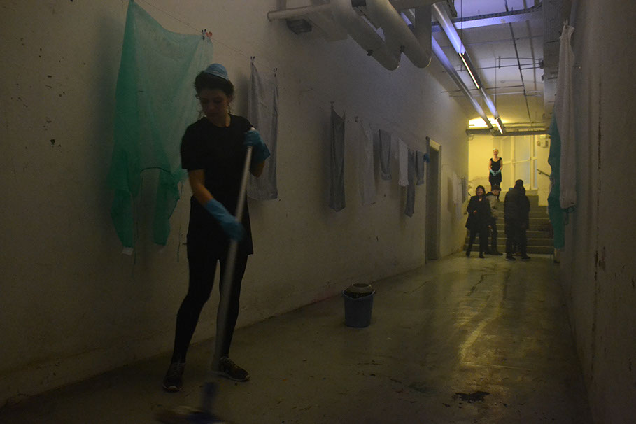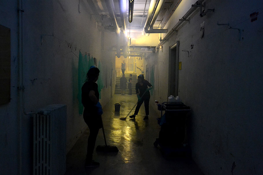 Plusieurs femmes nettoient continuellement l'espace du couloir. Le sol est toujours mouillé. On entend des bruits d'eau.