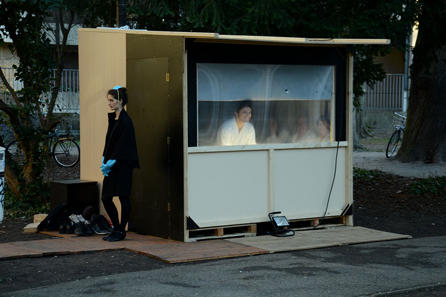 Avec Thermostat 8, nous nous sommes attachées à laisser le choix aux spectateur·rice·s, dans un processus pourtant autoritaire. Nous avons aussi désiré jouer sur le paradoxe entre un accueil dans un univers aseptisé où l’individu·e n’est considéré·e que comme tel·le, et une expérience inhabituelle commune à l’ensemble des individu·e·s participant·e·s, qui par là même deviennent groupe.