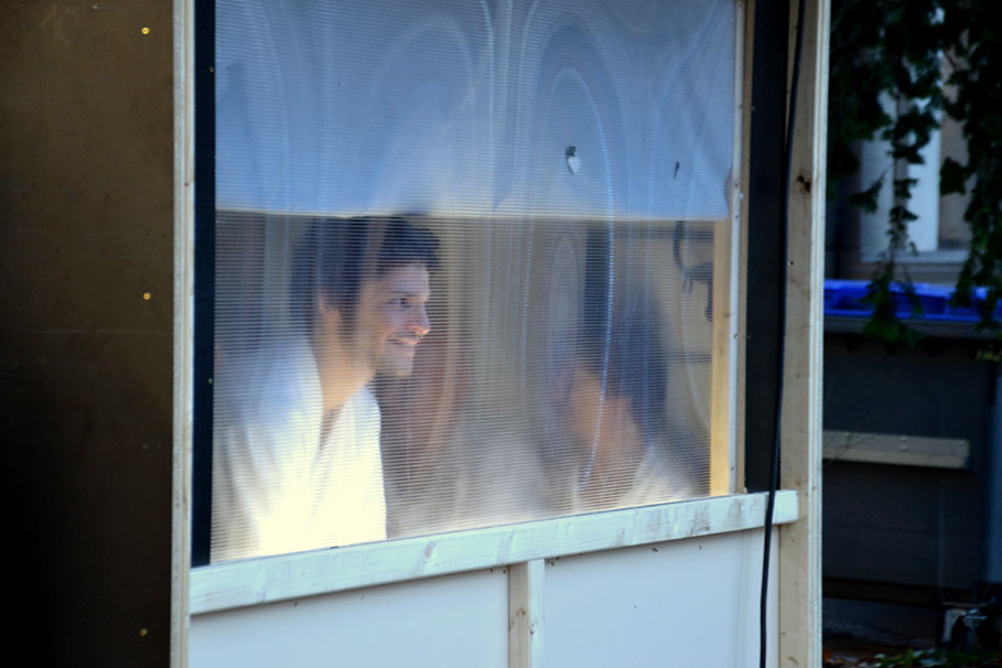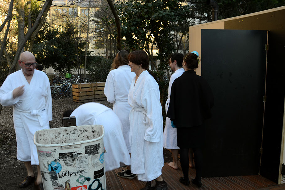Dans le jardin, devant le chemin menant au bâtiment, a été installée une cabane, un sauna. Le groupe y entre.