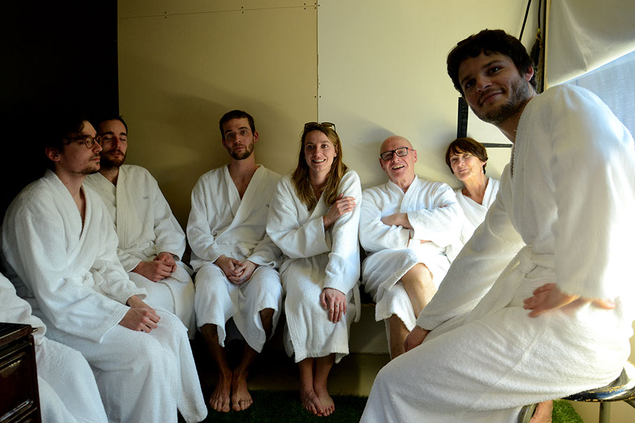 Au bout de 15 minutes, le groupe est invité à sortir. Sur son trajet du retour, il croise le groupe suivant, également en peignoirs.