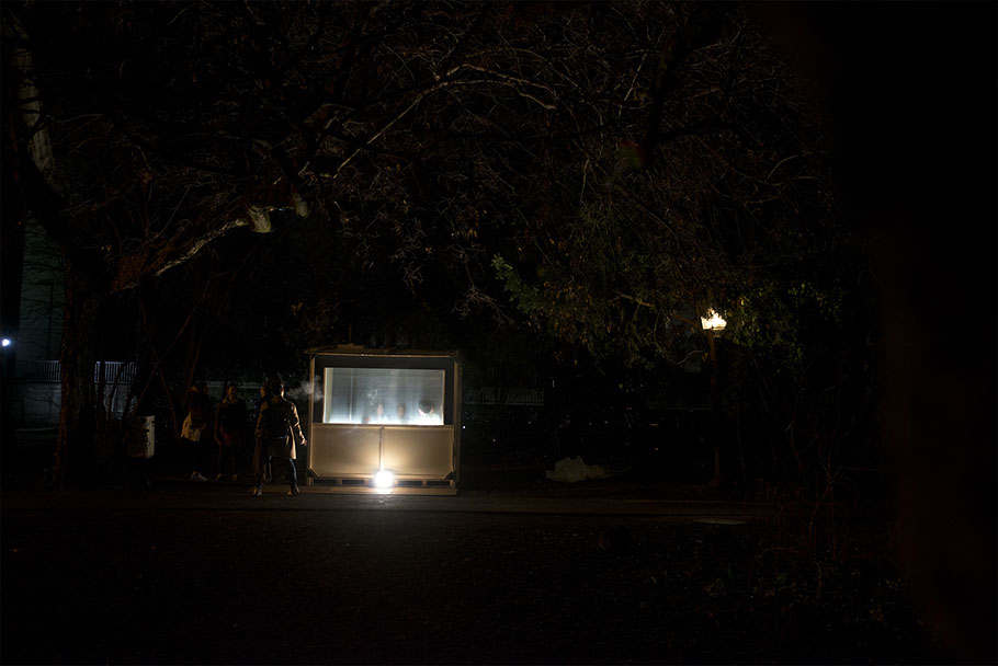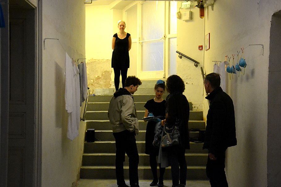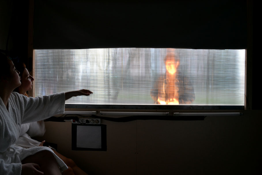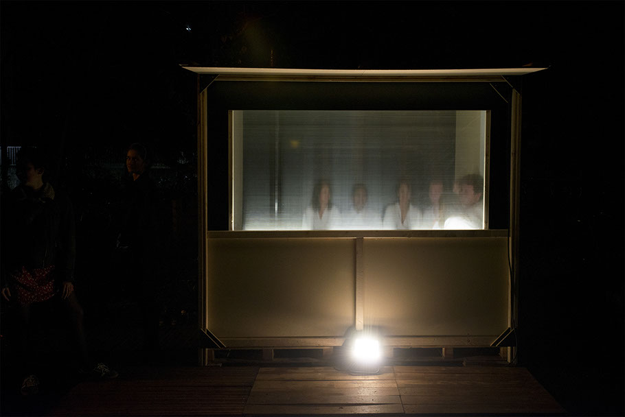 Les spectateur·rice·s sont confronté·e·s à un rideau transparent. Derrière, on devine des silhouettes en mouvement, et des bruits aussi.