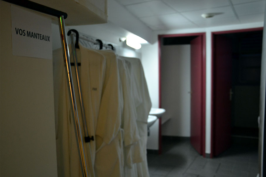Les visiteur·euse·s sont invités à se désabiller entièrement, et à se vêtir d'un peignoir blanc qui leur est remis à leur entrée dans le vestiaire.