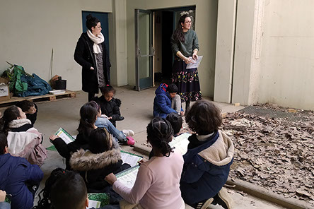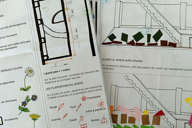 L'atelier. Représentation de l'espace du jardin et projection de son devenir à la fin de la saison. Sélection de formes et de couleurs, collage.