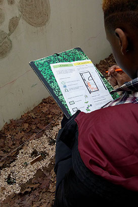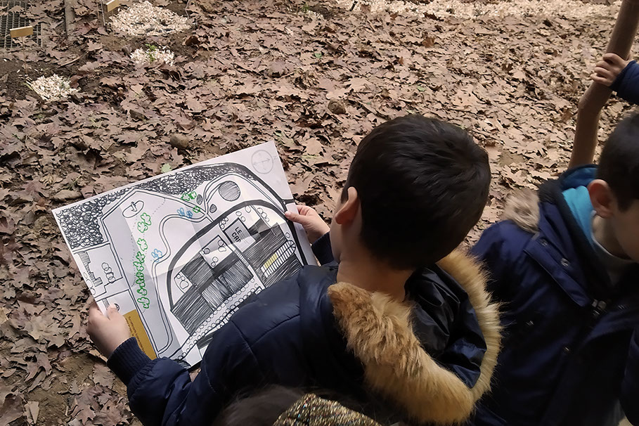 Le jardin. Repérage sur plan. Mesure de l'espace à partir de l'échelle du corps. Rescencement des plantations.