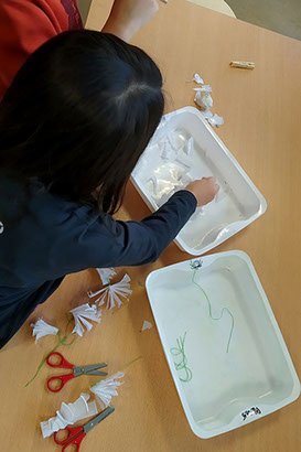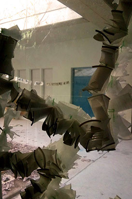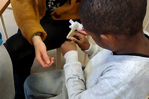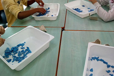 Séance 2. Extraction du moule et réemploie de sa matière plastique pour créer une fresque décorative, placée sur la porte vitrée qui marque l'entrée du jardin du CAP.