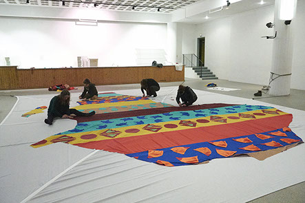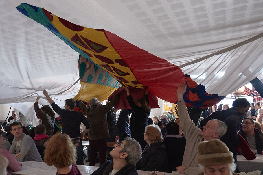 Le lever de la carte constituait un moment-pivot du déroulé de la journée festive. La toile était déployée à l'aide des spectateurs qui, se la passant de main en main, soutenaient tou.te.s ensemble le poids du tissu, jusquà ce que celui-ci puisse être hissé au-dessus des convives.